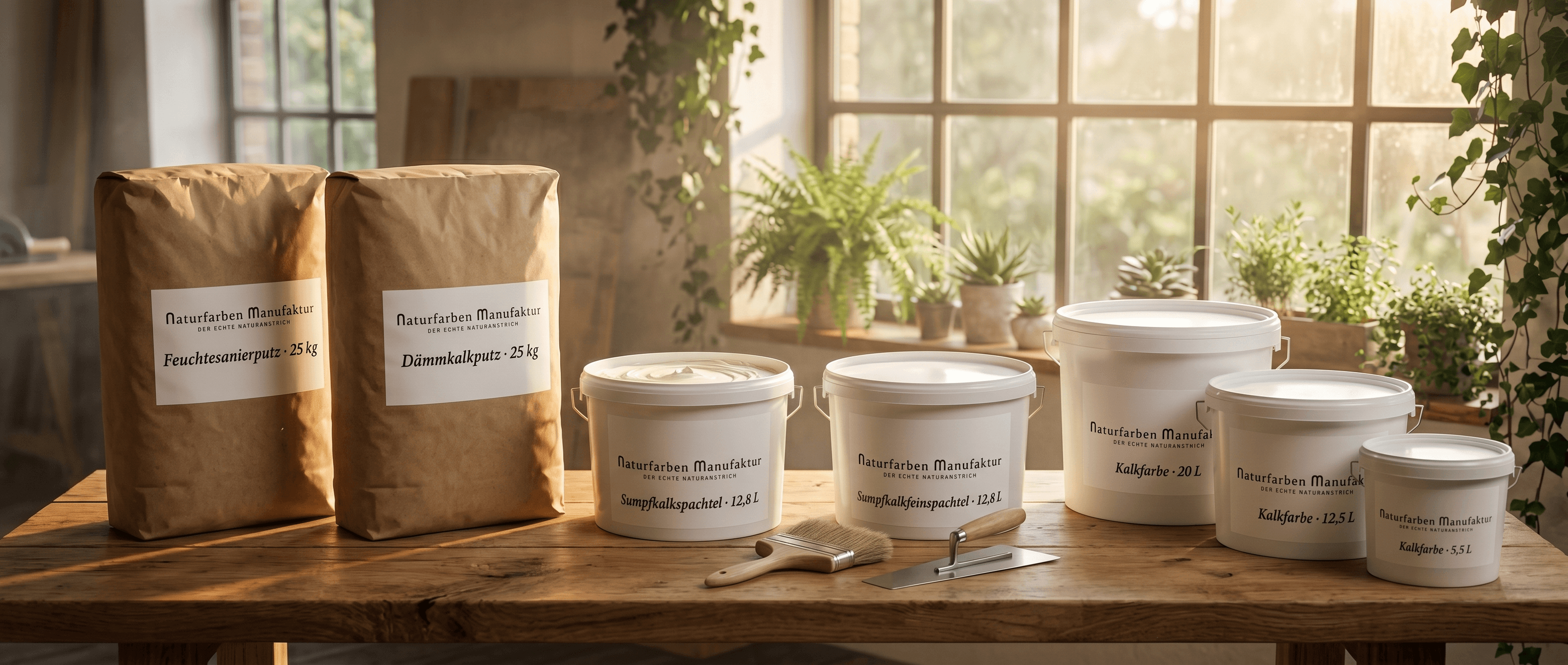 Was als Kalkfarbe begann, wuchs schnell zu einem ganzen System: Sanierputze für feuchtes Mauerwerk, Dämmputze gegen Kältebrücken, Spachtelmassen für glatte Oberflächen. Heute umfasst unsere Manufaktur fünf Produktlinien — alle mit demselben Anspruch: gut für den Menschen, gut für das Gebäude.